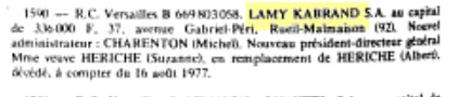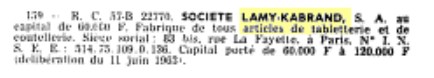 а на втором, 1953 года: trousses toilette voyage couture manucure наборы: туалетные, для путешествий, для шитья, маникюрные. На последней странице прейскуранта и на счете фактуры 1953 года видим: (я сделал коллаж) usine a Rueil-Malmaison, это: завод в городе Рюэй-Мальмезон, ныне пригород Парижа. В этом городе завод находился по адресу: 3, avenu Gabriel Peri. Из коммерческих справочников 60х годов профиль фабрики: fabrique de tous articles de tabletterie et de coutellerie, где tabletterie это производство мелких предметов роскоши из кости и ценных пород дерева, а coutellerie, соответственно, ножевое производство, столовые приборы. Директорами, в разное время были: вдова Suzanne HERICHE, Marie-Claire HERICHE, Albert HERICHE. Судя по такой преемственности, это и есть владельцы, семейство HERICHE. Последнее упоминание о фирме KABRAND, в коммерческом справочнике, было в 1991 году. Spoiler Show Фирма LAMY KABRAND, торговые марки: KABRAND, ARNOLDI, NESSEL, ORNO, LAMY