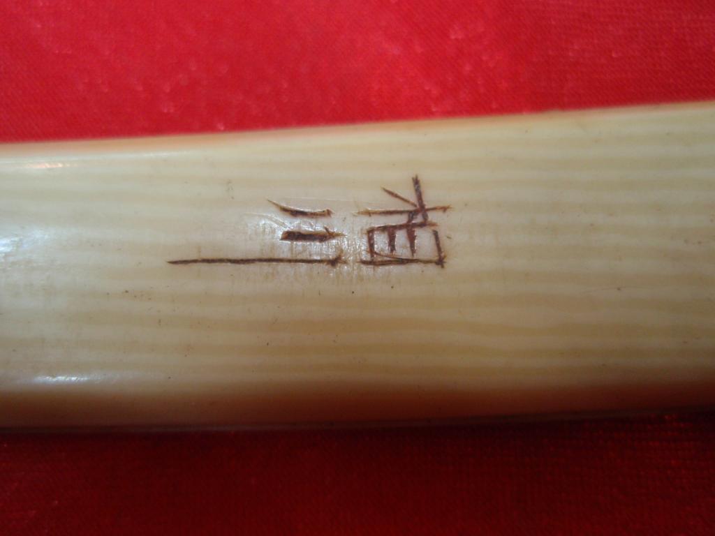 Любопытно, что на рукояти вырезаны иероглифы 相川 xiang chuan сян чуань, или, насколько я понимаю, Аикава в японском произношении (тут меня товарищи японисты может быть поправят) - стало быть, принадлежала какому-то японскому товарищу по имени Аикава. Что, разумеется, ценность ее никак не повышает, так как кто такой этот Аикава - даже сама богиня Аматэрасу не ведает. )))