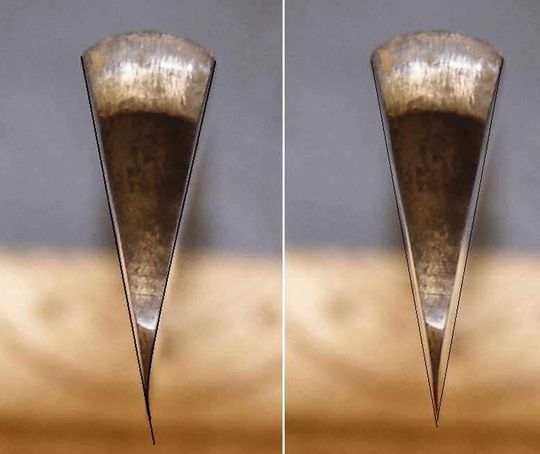 Видно, что реальный клин не представляет собой равнобедренный треугольник, это и понятно. Назвать эти бритвы, бритвами, имеющими вогнутость так же нельзя. Клины скорее "впуклые", чем выпуклые