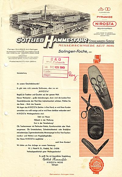 Интересная ссылка. Человек занимается восстановлением столовых приборов. Мужчина получил на Gottlieb Hammesfahr & Co. AG, Nirosta-Werk эту редкую профессию. Там есть контакты, можно просто позвонить и спросить может он чего знает о фабрике. Это может сделать , к примеру, Bea Jee. Можно письмо написать. Ремонт опасных бритв, звонить с 11-00 до 23-00, +79267729357, (viber, whats app, telegram, VK), спросить Олега.