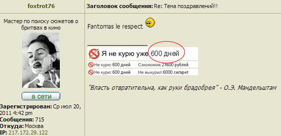 Re: Тема поздравлений!!foxtrot76, поздравляю с 600 днями некурения!