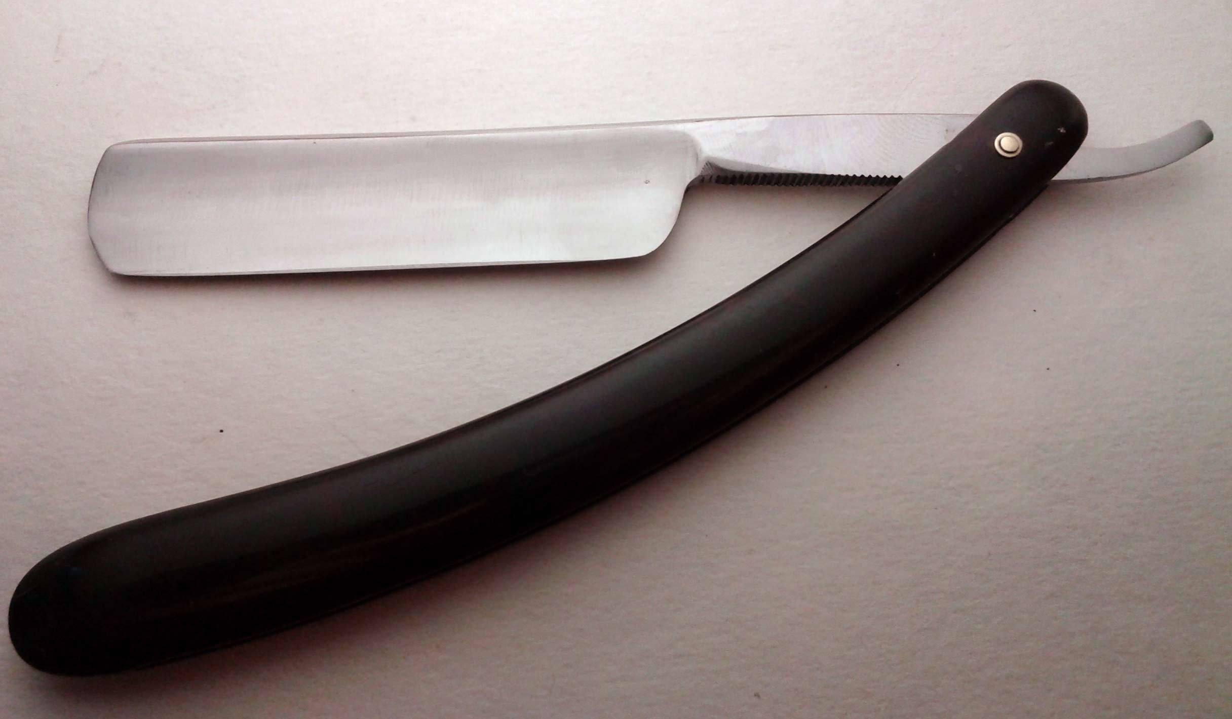 Ручка - эбонит, клинышек из металла. Клинок довольно близок к заводской геометрии, весьма мало был в использовании. Заточена и полностью готова к бритью. Ширина полотна 19,5 мм, толщина в обушке 5,5 мм. Цена 75 евро, доставка включена.
