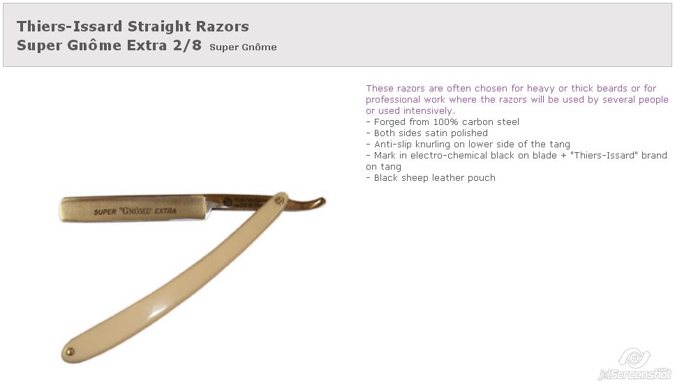 Re: Выбор бритвы, помощь, консультацияДа, это Супер Гном 6\8, а точнее "Super Gnome Extra", 6/8, C135 "Carbonsong" Steel... Скорей всего, они уже давно выпускаются различных размеров, просто как я понял у опасных бритв не большой круг поклонников, по этому на многих сайтах выкладываются ходовые модели... Ну или они их выпускают не большое количество и на экспорт не отправляют... Мне попадались и 4/8 и 5/8 и даже 2/8, только 11/16 и 7/8 не видел. На фото "Super Gnome Extra", 2/8. (Super-slim 2/8” blade for the finest detail work, ideal for beard shaping and all those nooks and crannies!)