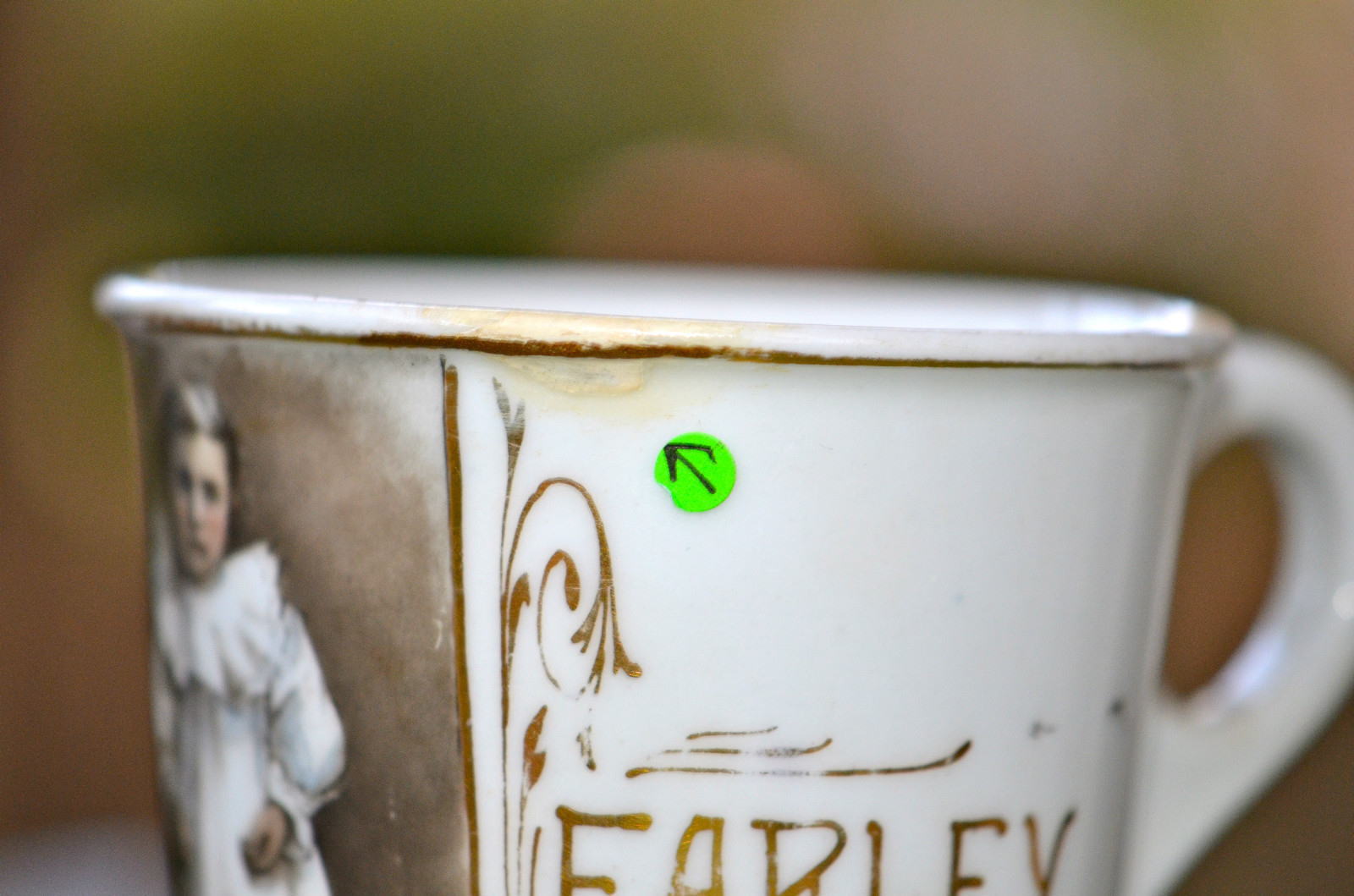 Fantastic photographic shaving mug of young child shaving mug. Mug is 3 and 5/8" tall, Hegner Barber supply mark on bottom out of Minnesota and Limoges markings. Came out of an old collection of shaving mug. Small old repair on rim to right of photograph, several photos showing repair, and a hairline in the handle, the handle has not been broken off, just a hairline only. Great large and clear image.