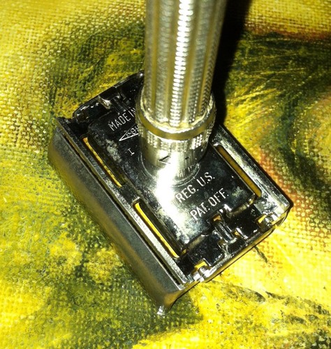 Учитывая, что покупал у 3-х разных продавцов, удивлен тем, что механизм регулировки лезвия работает четко, а открытия/ закрытия крышки - мягко и плавно. Не думаю, что элементы внутри нуждаются в какой-то смазке.Полностью металлическое изделие. Кстати, последняя продукция Gillette, которая изготавливалась полностью из металла. Когда держишь в руке, чувствуется - качественная вещь. Если не удастся продать - одни станок с удовольствием оставлю себе, два других подарю друзьям Более подробная информация и цены с учетом пересылки указаны ниже. 1. M1 1967 г. Пятна на ручке, отсутствует краска на цифрах на ручке регулировке лезвия. Стоимость 32$ или 1000 руб 2. H2 1962 г. Небольшие точки на крышке. Стоимость 35$ или 1100 руб 3. I4 1963 г. Частично отсутствует краска на цифре 9. Стоимость 40$ или 1250 руб Добавлено спустя 1 минуту 21 секунду: Фотографии M1 Добавлено спустя 4 минуты 10 секунд: Фотографии H2 Добавлено спустя 4 минуты: Фотографии I4 Re: Gillette Slim AdjustableСтанок I4 1963 г продан