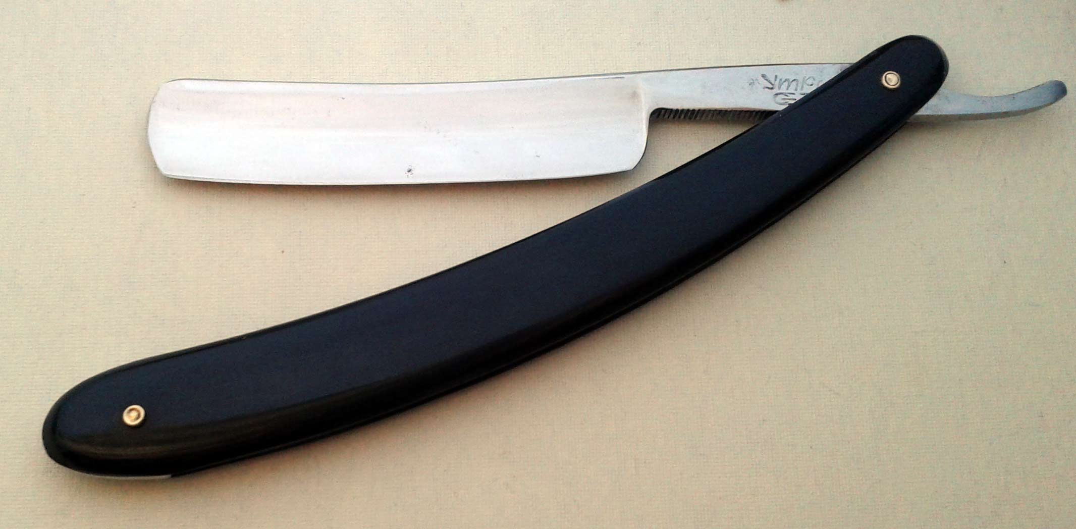 Сведения о производителе: http://britva.ru/forum/viewtopic.php?f=28&t=1663" onclick="window.open(this.href);return false; Ручка - эбонит, в приличном состоянии, клинышек из металла. По-видимому, ручка и пины родные. На полотне присутствуют небольшие "следы времени". Заточена и полностью готова к бритью. Ширина полотна 16,5 мм, толщина в обушке 4,5 мм. Цена 60 евро, доставка включена. Spoiler Show