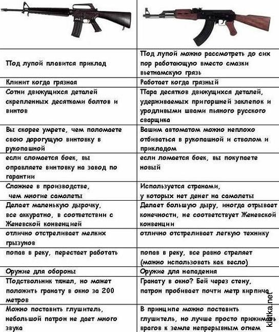 Про метровую стену особенно рассмешило. Есть АК и с глушителем и подствольником, и со всякими прицелами. Только вот АКМ-74 и АК-47 разные по характеристикам. Особенно АКСУ-74, которые наша часть получила в 1988г., совсем не понравился. Быстро грелся, начинал плеваться пулями и те падали на расстоянии 3-5 метров. АКМ-74 ближе подходит под "Женевскую конвенцию". Ощутимо легче предшественника. АК-47 производили в половине земного шара, в первую очередь страны Варшавского Договора, Китай, Африка и Латинская Америка. В Америке с Ак-47 предпочитают ходить на кабанов. Каких только разновидностей прикладов и цевья не выпускали. У него характеристики очень хорошие, кроме кучности и точности на больших расстояниях. В этом он уступает М-16, по скорострельности тоже. Чистка автомата - геморрой еще тот. Так мы в армии научились их мыть под краном, под струей воды. Потом все насухо протирали, т.к. особо укромных мест мало и смазывали. Проблем никогда не было. Также после стрельб, сразу в поле вынимали поршень, втыкали в песок и крутили - очищали от нагара (потом естеств. протирали ветошью), из-за которого образовывались раковины и каверны на поршне. Так требовали офицеры, многие из которых прошли Афган. Думаю Америки не открыл... Одним ударом дерева не срубишь. . Татарская поговорка