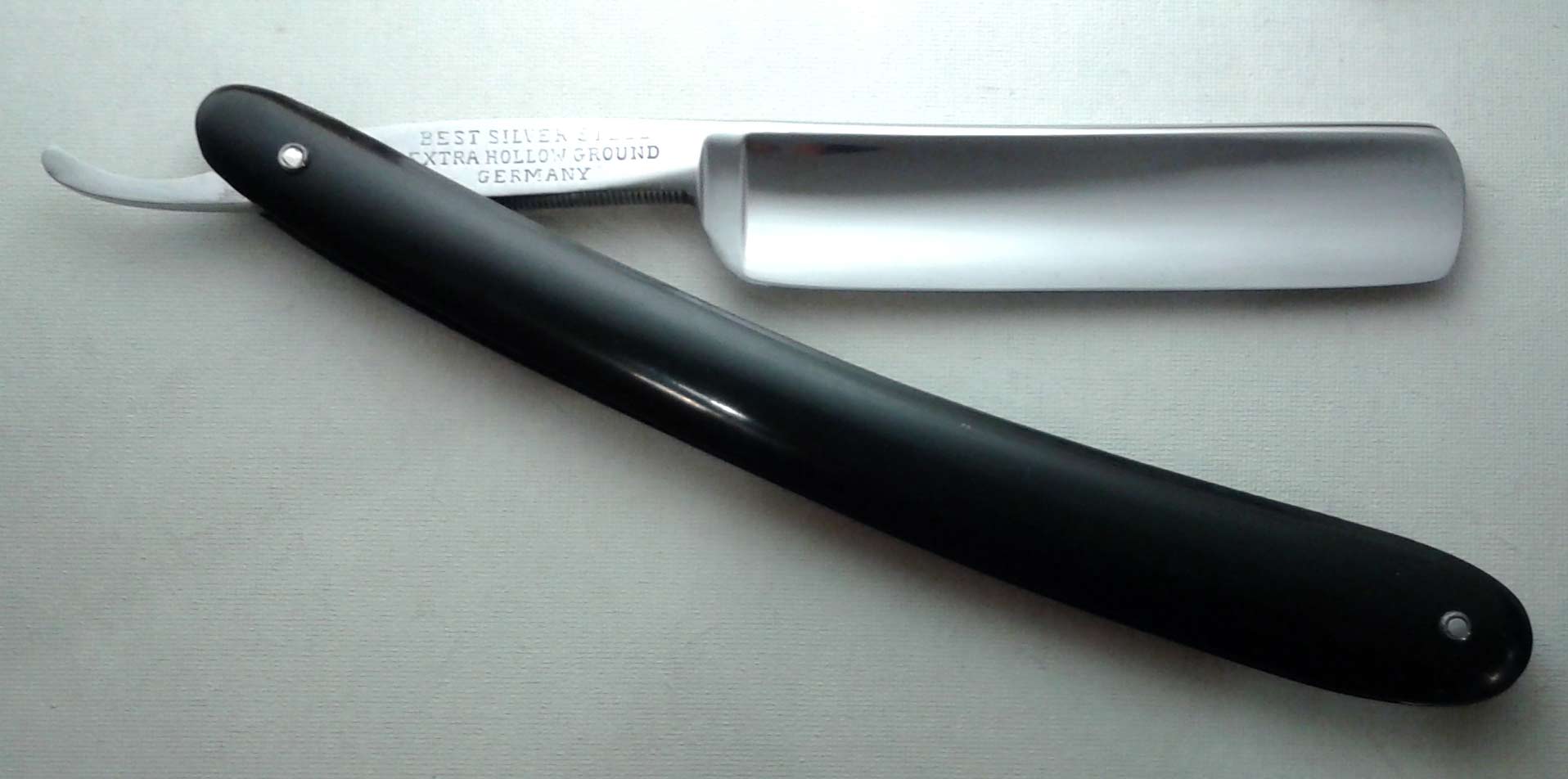 Надпись на обратной стороне эрля: BEST SILVER STEEL EXTRA HOLLOW GROUND GERMANY. Ручка из эбонита, в отличном состоянии. По-видимому, ручка, клинышек и пины родные. Заточена и полностью готова к бритью. Ширина полотна 17 мм, толщина в обушке 4.5 мм. Цена 65 евро, доставка включена.