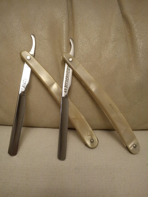 BIEDERMEIER.Пара бритв BIEDERMEIER.Маленькие бритвы,длина лезвия всего 11,3 см.Хотел бы узнать почему такая форма бритвы.Эти бритвы для специальных целей?Или это обычные бритвы,просто немецкая экономия и бережливость металла