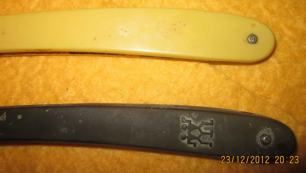 Re: Пара довоенных бритвНижняя ручка с пляшущими человечками, если она в нормальном состоянии, очень может пригодиться впоследствии, если попадётся клинок "хенкельс" с убитой ручкой (опять же занедорого).
