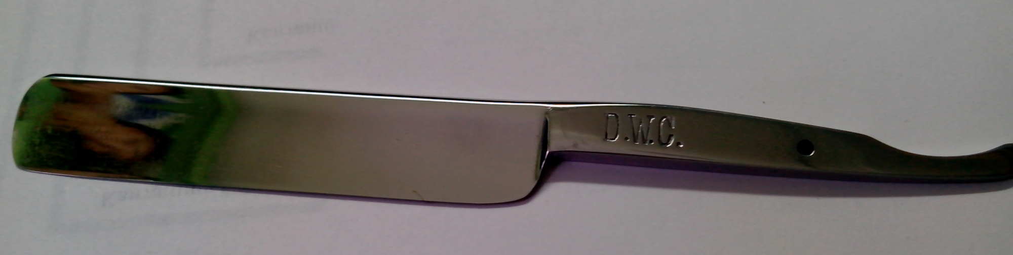 помогите опознать D.W.C.Здравствуйте .Приобрел у знакомого бритву в плачевном состоянии.Поскольку я новичок опознать ее мне проблематично и прошу Вас (гуру) помочь . Не знаю важно это или нет-головка была прямоугольной( был скол пришлось переделать), оправа без опознавательных знаков из темного материала похожего на рог. О стали сказать пока ничего не могу (еще не точил). Спасибо