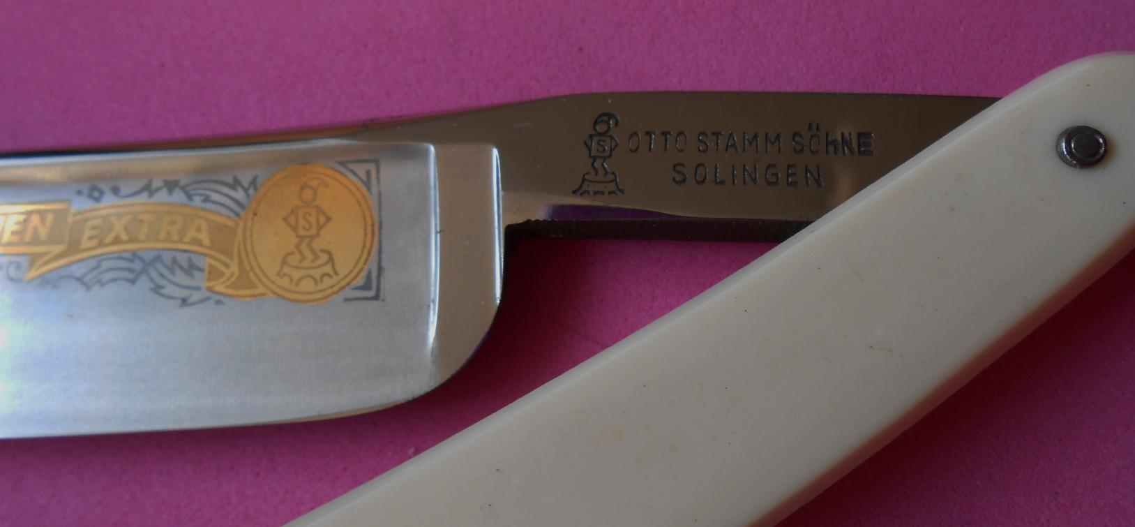 Предлагают её за 60 евро (находится в Германии). Бритва вот с такими данными: клеймо интересное: человечек в колпаке стоит на пне? (или барабане?), "руки в боки", на груди (животе) буква с"S", затем OTTO STAMM SÖHNE