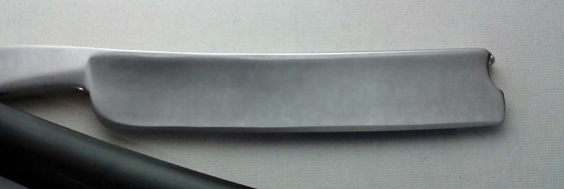 Видимо, бритва от интернациональной (Англия-Германия) фирмы типа KROPP. Ручка из целлулоида, в хорошем состоянии. На полотне имеются "следы времени". Возле обушка канавка неизвестного происхождения. Скорее всего - так называемый "заковыш", образовавшийся при изготовлении металлической заготовки. В любом случае, функциональность бритвы никак не затрагивает. Заточена и полностью готова к бритью. Ширина полотна 16 мм, толщина в обушке 4 мм.