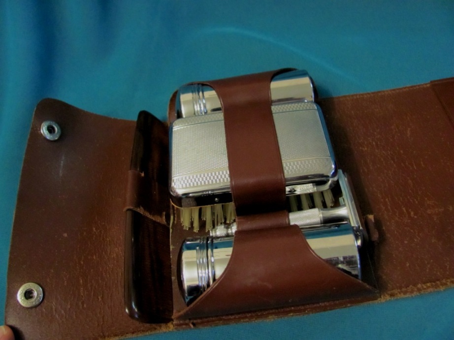 Все в приятной сохранности, щадящая эксплуатация была. В наборе : 1.Станок Gillette ( как новый) 2.Щетка для одежды ( крепкая щетка, волоски все на месте 3. Расческа ( все зубы на местах, пластик цветом под рог сделан). 4. 2-е емкости, видимо под мыло и помазок ( внутри есть следы от окисления). 5. Футляр из кожи, коричневого цвета ( для его лет, выглядит достойно). Предметы все вымыты, продезинфицированы, готовы служить дальше. Цена 50 евро, доставка включена. ПРОДАН. несессер Show