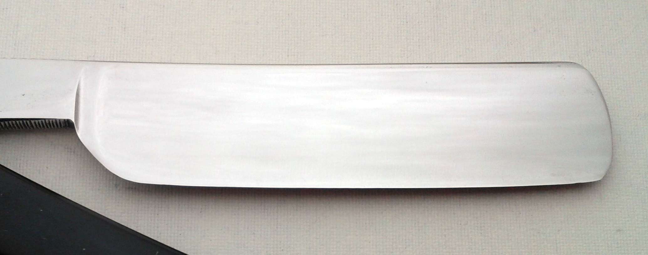 Ручка - целлулоид, в отличном состоянии. Бритва, по-видимому, почти или совсем не точилась после завода, полотно в заводской геометрии. На головке имеется трещинка на обушке (видна на фото). Трещинка не глубокая - примерно 1 мм глубиной, при нормальной эксплуатации проблем не создаст. Заточена и полностью готова к бритью. Ширина полотна 18,5 мм, толщина в обушке 5,5 мм. Цена 75 евро, доставка включена.