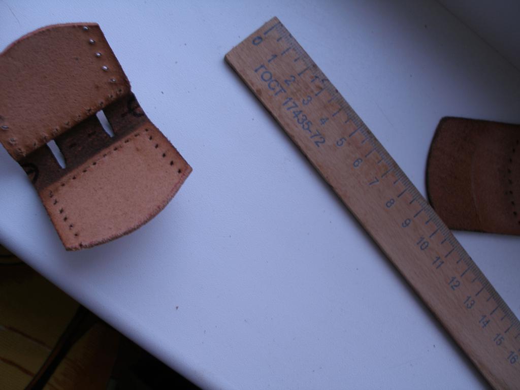 Если кожа сильно потерта и смущает владельца, можно обработать воском и заполировать сукном (опция). Намечаем и вырезаем по центру этого изделия выемки (изначально скоба шире)