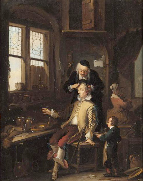 Re: Опасная бритва в искусстве ( картины, рисунки, фото, тату) Серия художественных работ о парикмахерах, цирюльниках и брадобреях! Карл Блох Уличный цирюльник 1868 г. Часть третья Show Адриан Ян ван Остаде Извлечение парикмахером зуба 1630-35 г.г.