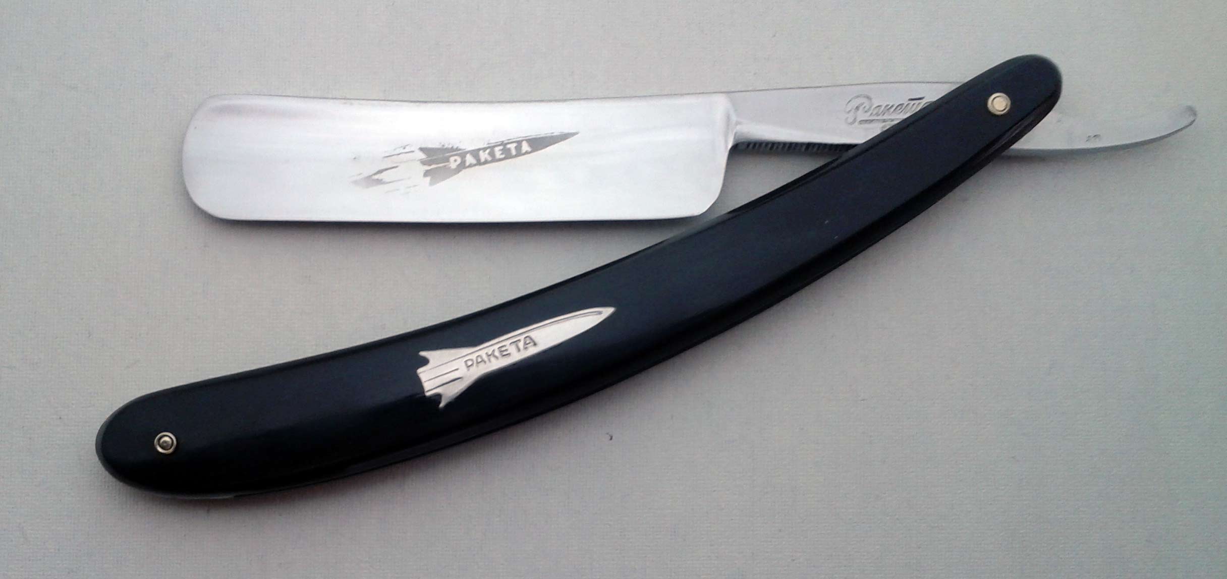 Ручка родная, в отличном состоянии. Бритва точилась, однако немного и аккуратно. Коррозии почти не было, удалось сохранить рисунок ракеты. Заточена и полностью готова к бритью. Ширина полотна 17 мм, толщина в обушке 4 мм. Цена 40 евро, доставка включена.