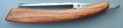 "Here they are by request from my customers; the squared point 8/8" wide scalloped back Henckels Friodur razor from the famed Zwilling-Twin Works of Solingen, Germany. My supplier discovered a cache of unground Henckels Friodur razor blanks in his home town of Solingen. I am able to offer a quantity of these fine "ice hardened", (cryogenically treated), INOX "no stain" stainless steel razors for your shaving enjoyment. They have been recently ground and the spine modified by one of the few remaining Master Razor Grinders of Solingen. This beautiful razor has David Stevens custom handles made of olive wood. It will arrive in a rosewood presentation case."