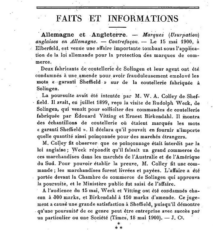 Иск был подан г-ном В. А. Колли из Шеффилда. В июле 1899 к нему был визит Рудольфа Вик из Золингена, который приехал, чтобы получить заказ на столовые приборы производителей Edouard Vitting и Ernest Birkendahl. Вик показал образцы столовых приборов, которые были отмечены как "garanti Sheffield" и сказал, что может предоставить любую партию на зарубежные рынки.