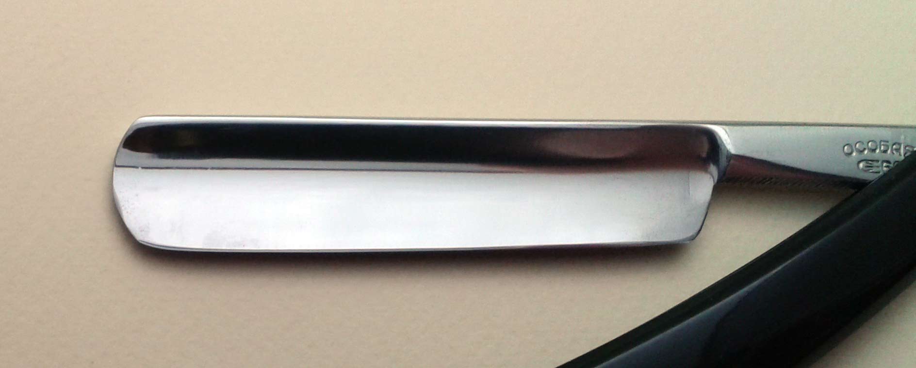 Ручка - эбонит, в отличном состоянии, легкий зеленоватый налет времени. По-видимому, ручка, пины и клинышек родные. Заточена и полностью готова к бритью. Ширина полотна 17 мм, толщина в обушке 5 мм.