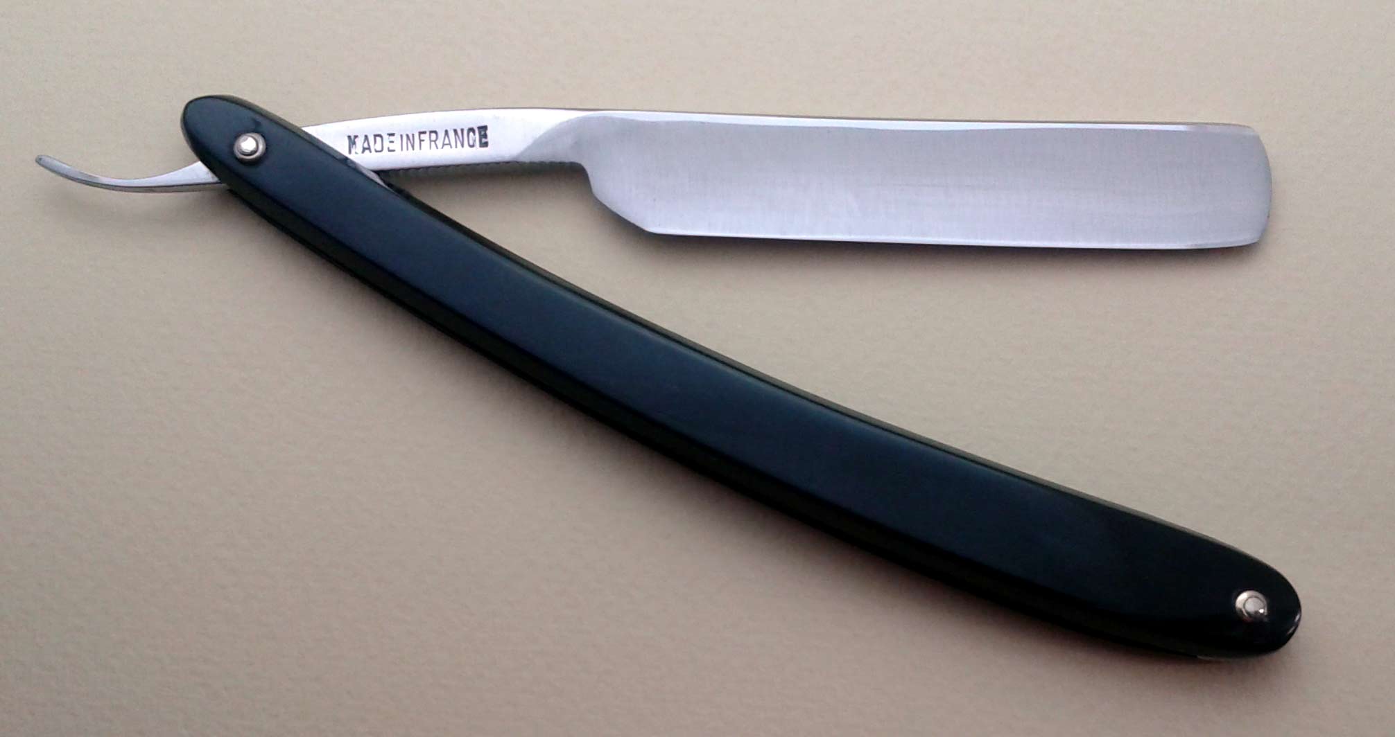 Это моя первая иномарка, если так можно сказать про бритву. Дома снял смазку. Полюбовался. Тяжелее и массивнее моей "Ракеты", но в руке лежит уверенно. Обушок толстый, около 6 мм., клинок 20 мм. в ширину, это по буржуйски более 6/8 дюйма. Полировка лезвия кстати похуже чем у "Ракеты", но эрл и обушок вылизаны в зеркало. Полюбовался и первым делом под микроскоп. На увеличении х80, х200 просмотрел всю длинну РК. Заводская заточка очень качественная. Сравнима с машинной заточкой безопасных бритв. РК по всей длинне ровная, гладкая. В боковом свете видно что спуски без "завалов", лишь у самой пяточки участок с назначительным "завалом" Тест на волос не проходит. Все равно решил побриться. Правил на чистой коже. Проходов 20-30. Бреет мягко, чисто. На щеках даже осмелился одним проходом против шерсти. О Чудо. Ощущение как буд-то резиновым шпателем по коже. Решено. СТЗовскую "Ракету" на пенсию. Теперь юзаю только мою француженку. 32 года активно мусолю харю клинковой бритвой