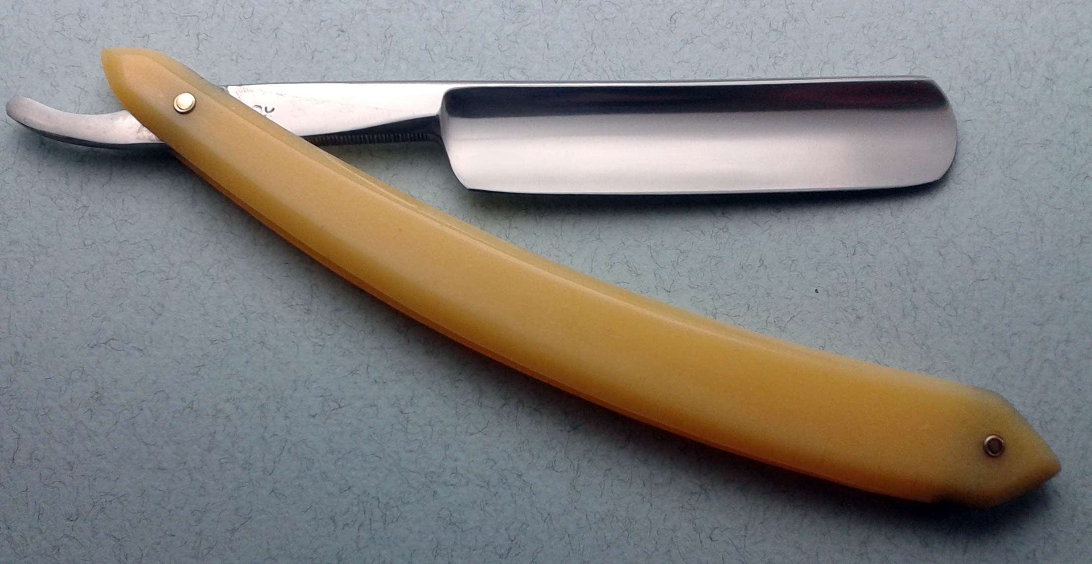 Надпись на хвостовике: MADE IN GERMANY Ручка - целлулоид, посередине перламутровая вставка. Имитация рога, но я не знаю какого именно - есть столовые ножи из такого же по виду натурального материала. По-видимому, ручка, клинышек и пины родные. Заточена и полностью готова к бритью. Ширина полотна 17 мм, толщина в обушке 4.5 мм. В комплекте родной футляр в приличном состоянии.