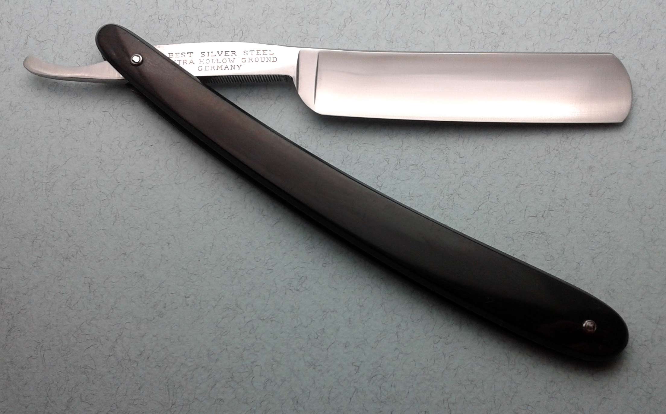 Ручка - эбонит, в отличном состоянии, по-видимому, родная. Этой бритвой побриться не успел пока, но как всегда, хочу особо отметить Silver steel. По моему мнению, это очень удачная сталь на немцах, отлично держит заточку и при этом комфортна в бритье. Заточена и полностью готова к бритью. Ширина полотна 17 мм, толщина в обушке 4.5 мм.