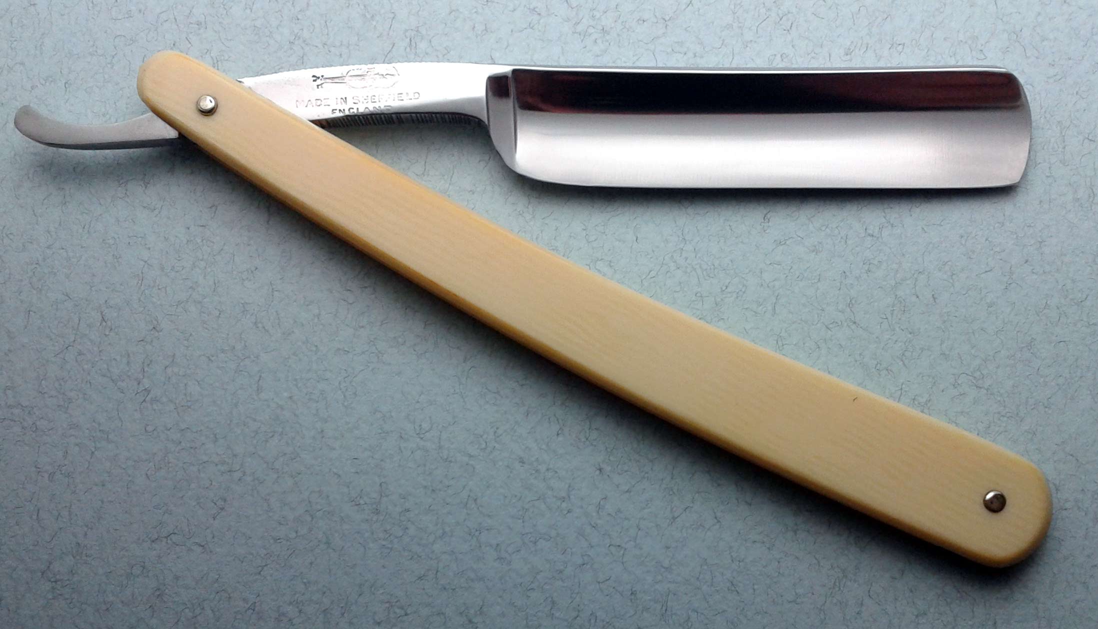 Сведения о производителе: http://britva.ru/forum/viewtopic.php?f= ... lit=haddon" onclick="window.open(this.href);return false; Ручка - целлулоид, имитация слоновой кости - в отличном состоянии, клинышек - металл. По-видимому, ручка, клинышек и пины родные. Заточена и полностью готова к бритью. Ширина полотна 17 мм, толщина в обушке 4.5 мм.