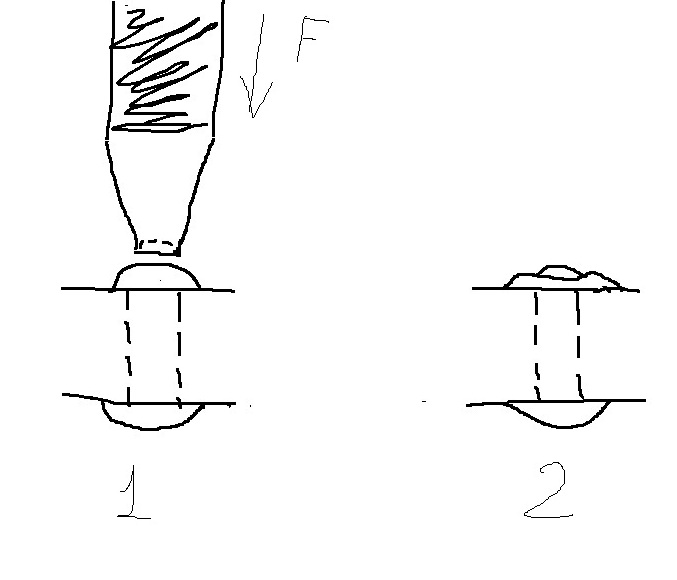 1)Молоток должен быть с идеально гладким , желательно округлым ударником(считай полированным). не большого веса до 100г максимум. 2) Оставлять припуск на формирование головки(общепринятый стандарт) 1,3-1,5-диаметра стержня заклепки. 3) Сначала делается удар по центру для уплотнения соединения, потом круговыми движениями молотка примерно под углом 45градусов формируется головка заклепки.