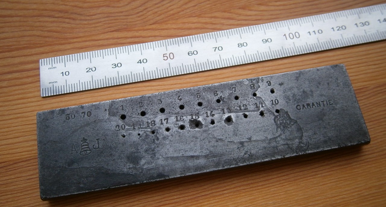 Re: Продается от Eduard ZСНЯТА С ПРОДАЖИ Любителям аутентичных заклепок. Волочильная доска ювелирная. Размеры 114х32х6 мм. Первый диаметр 1,9 мм(или около того). Мне досталась с воском в фильерах - видимо, несмотря на возраст, использовлась по назначению. Попробовал тянуть медную проволоку - через 1-2 прохода возникает эффект наклепа - нужно отпускать. Плюнул. Может кому интересно поиграть. Цена 15-5= 10 евро. Доставка по Украине включена.
