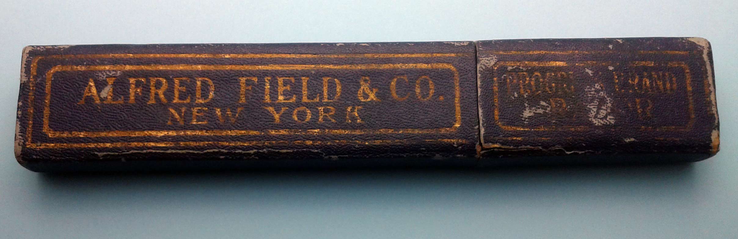 Обратная сторона эрля: A.P.&CO NEW YORK PROGRESS BRAND Ручка - эбонит, в отличном состоянии, родная. Бритва точилась немного и аккуратно. Коррозии также было немного, так что можно говорить, что бритва довольна близка к своему заводскому виду. Заточена и полностью готова к бритью. Ширина полотна 13.5 мм, толщина в обушке 4 мм. В комплекте родной футляр в приличном состоянии.