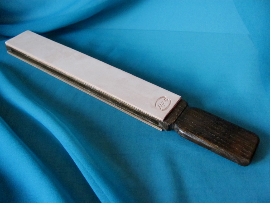 Материал: Древо-дуб, поверхность обработана карнаубским воском. Кожа: чистая сторона-американская корова, пастированная -корова СССР. Размеры: длина рабочей поверхности 27 см, ширина 4.5 см. Цена : 40 евро. Продан Доставка: Украина за мой счет, СНГ + 5 евро.