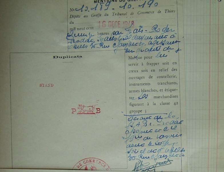 Фирма PRADAT BRUN зарегистрирована 14 апреля 1904 в г.Тьер, как производитель бритв. Место расположения Thiers 36 rue Gambetta. Товарный знак барсучья кисть.