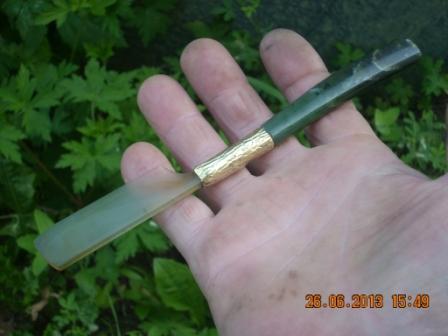 YOUTUBE Олег Бритва INSTAGRAM Олег Бритва Re: Каменная БритваИтак господа. Сделал я ещё одну бритву, только по японским мотивам. Для клинка взял сердолик. Он твёрдый, скрытно-кристаллический. Рукоять нефрит, вставка латунь. Свёл РК в ноль. Дальше как точить и править не знаю. Но знаю точно, чем тоньше правишь РК, тем больше риска выкрашивания. Это не металл. Как декоративная вещь в музей пойдет. А заправить, чтобы бриться, даже не знаю. Стекло и обсидиан это аморфные вещества. У них не кристаллической решётки, у камня она есть. Вот поэтому при доводке начинается выкрашивание кристаллов. Вот что получилось: