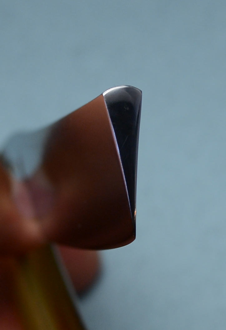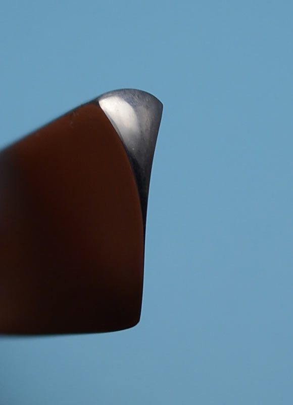 Ручка из целлулоида, в отличном состоянии, родная. Смело могу рекомендовать данную бритву для бритья, особенно для пользователя с опытом. Примерно 3 месяца назад купил себе точно такую же бритву и с тех пор ей брился бОльшую часть времени. Очень чисто выбривает за счет своей клинообразной геометрии и при этом весьма мягко и беззвучно работает. К сожалению, не удалось сделать адекватные фото. Создается впечатление, что РК с "обратной улыбкой", но это не так. РК слегка выпуклая - это лучше видно на последнем фото, где показана геометрия бритвы. Заточена и полностью готова к бритью. Ширина полотна 13 мм, толщина в обушке чуть меньше 4 мм. В комплекте штатный футляр.