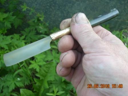 YOUTUBE Олег Бритва INSTAGRAM Олег Бритва Re: Каменная БритваИтак господа. Сделал я ещё одну бритву, только по японским мотивам. Для клинка взял сердолик. Он твёрдый, скрытно-кристаллический. Рукоять нефрит, вставка латунь. Свёл РК в ноль. Дальше как точить и править не знаю. Но знаю точно, чем тоньше правишь РК, тем больше риска выкрашивания. Это не металл. Как декоративная вещь в музей пойдет. А заправить, чтобы бриться, даже не знаю. Стекло и обсидиан это аморфные вещества. У них не кристаллической решётки, у камня она есть. Вот поэтому при доводке начинается выкрашивание кристаллов. Вот что получилось:
