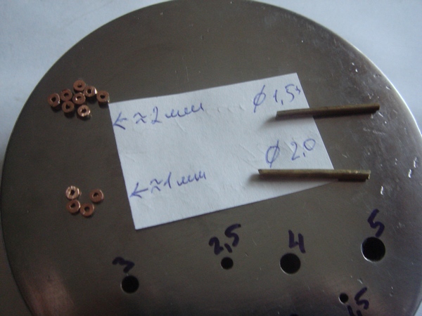 Решил попробовать сделать шайбочки под 1,5 и 2.0 мм латунную проволоку проволоку. Получилось не очень,но выводы были на будущее сделаны Первый и главный вывод: из трубки удобнее делать нежели из пластин. Можно играть с толщиной. Второй: если буду еще делать шайбочки для 2,0 проволоки ,то сделаю их на конус( так красивее получится). Ну и отчетик небольшой,может кому придется ко двору "Эта нога.... у кого надо нога"