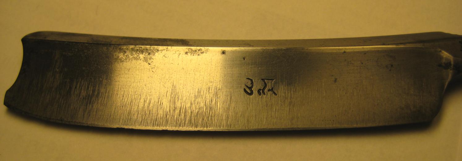 Однажды купил недорого вот такую старую бритву из-за необычной формы шейки. Ручка из рога в плохом состоянии, заклёпка серебро или "новое серебро", проставка между половинками ручек из серого металла. Но самое для меня интересное в этой бритве - это клеймо на лезвии. Уважаемые форумчане, кто что думает или знает достоверно по этому поводу (иероглиф или может конкретного мастера знак и т.д.)? Мне очень интересно Ваше мнение! А также как вам сама бритва и её приблизительный возраст?