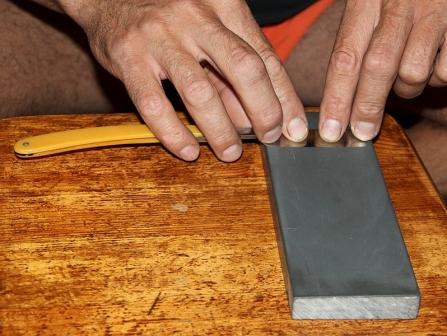 Самый лучший результат получился,если класть лезвие бритвы полностью на камень и работать обеими руками. При этом,прилагается некоторое усилие на кромку. Фотки ,как я держу бритву,скинул.