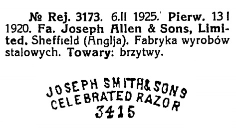 Добавлено спустя 9 минут 34 секунды: И такой: NON Re: JOSEPH ALLEN&SONS SHEFFIELDВ подтверждении. Joseph Smith & Sons 3415. С 1920 года принадлежит Аллену.