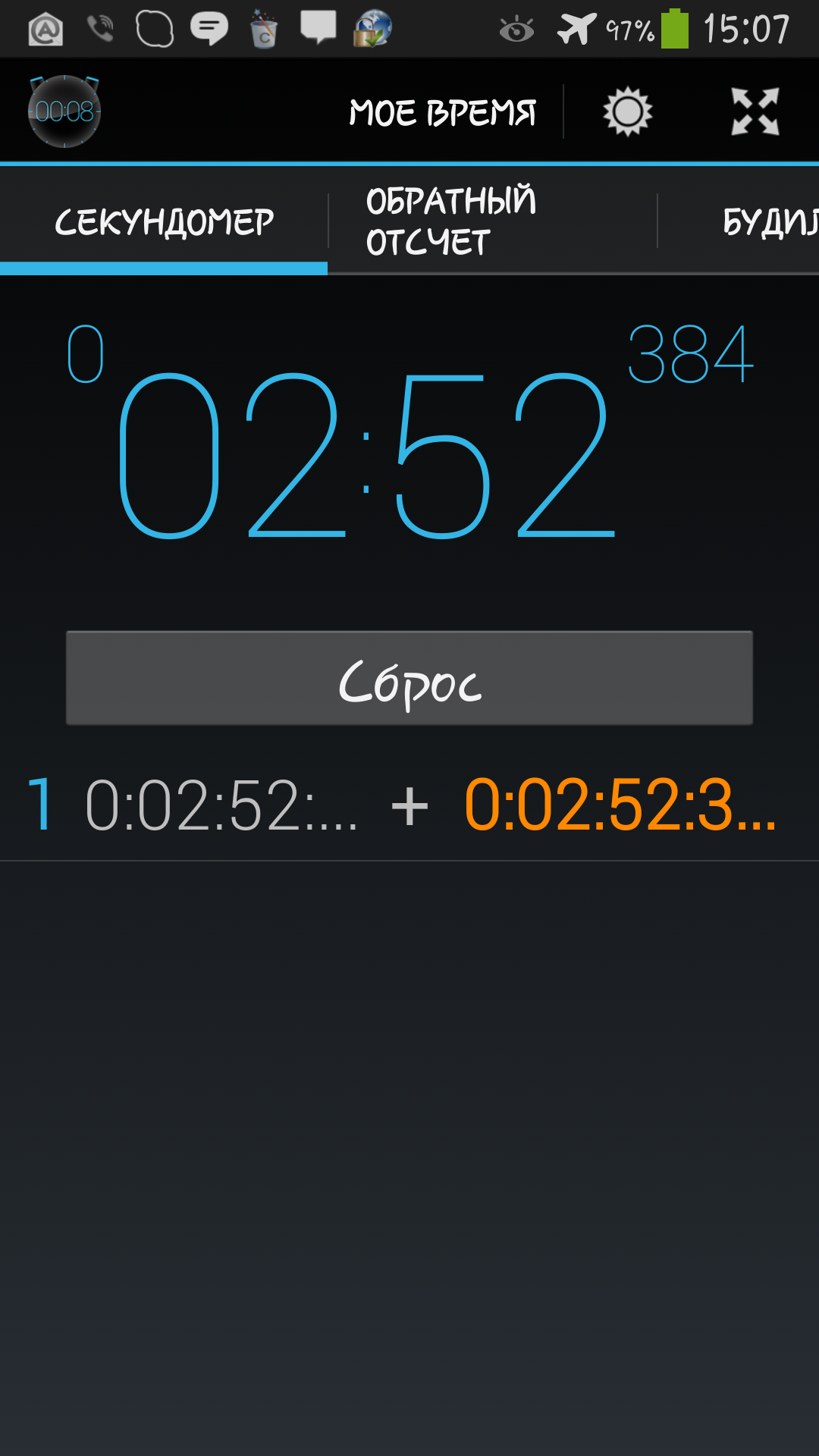 Я сделал это! Не судите строго за скриншот. Очень торопился и нажал не туда. Вместо СТОП, нажал КРУГ. Поэтому окончание бритья - это ВРЕМЯ ПЕРВОГО КРУГА. Но тем не менее. Старт бритья - взятие баллона с пеной в руку, окончание - сбривание последнего волоса у правого виска против роста волос. Бритьё классическое - один проход по росту, один - против. Из дефектов - почти ничего. Две маааалюсенькие красные точки, что не в счёт. После умывания холодной водой их не стало. Никакого раздражения. Результат на ощупь - вполне сносный. Из ошибок - потерял пол-минуты на допраспаривании после первого прохода. Вывод: три минуты - не предел. Думаю в две с половиной уложусь. Как и обещал - ещё два подобных тренировочных захода и ролик с меня. Ремонт опасных бритв, звонить с 11-00 до 23-00, +79267729357, (viber, whats app, telegram, VK), спросить Олега.