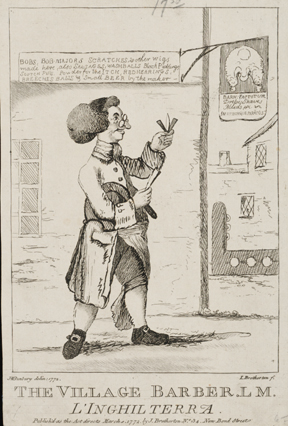 Henry William Bunbury (1750-1811) James Bretherton (fl. 1770-1781) London: Published by J. Bretherton, March 1, 1772. Hand-colored etching. 772.3.1.2 This barber holds the tools of his trade: a lancet, a razor, and a shaving dish. Over his house, shown in the background, is the sign of a wig, and a board advertises not only categories of wigs but also food and drink, washing aids, and cures for various ailments: "BOBS, BOB-Majors SCRATCHES [plain wigs] & other wigs made here, also SAUSAGES, WASHBALLS[soap] Black Puddings Scotch Pills, Powder for the ITCH, RED HERRINGS, BREECHES BALLS & small BEER by the maker."