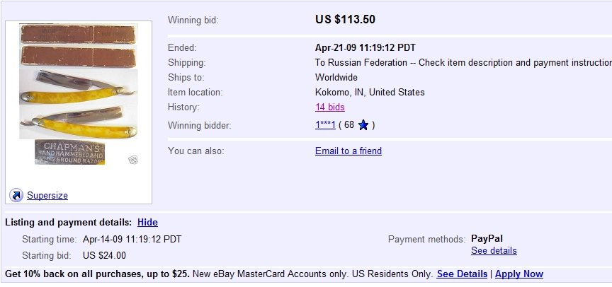 Re: CHAPMAN‘S HAND HAMMERED AND HAND GROUND RAZORSможет и неадекватная, но ушла она за $113.50