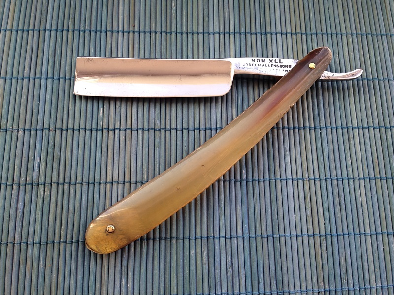 Ширина полотна 6/8 , оригинальные пины из латуни и ручка из рога . Заточена и готова к бритью .