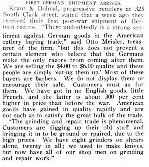 https://archive.org/stream/historicalen ... 0/mode/2up" onclick="window.open(this.href);return false; (Историческая энциклопедия памятных биографий Иллинойса 1929 год) рекламное объявление 1919 года: Kraut & Dohnal, ведущая фирма розничной торговли заявляет, что мы получили первую послевоенную партию немецких бритв. «Хотя, в Америке, есть сильные настроения против немецких товаров», говорит Otto Meisler, казначей фирмы, - «но мы верим, что это не коснется бритв немецкого производства. Наша цена от 4 до 6 долларов за качественные бритвы и люди расхватывают их. Но больше всего покупают парикмахерские. У нас есть и английские и немного французских бритв, но цена на них на 300 процентов выше, чем до войны.» Так же мы профессионально занимаемся гриндингом и восстановлением. Из за высоких цен, клиенты достают свои старые вещи, что бы восстановить. У нас есть восемь шлифовальных машин для ножниц и двадцать одна машина для остальных инструментов. Теперь в каждом нашем магазине есть работник, который занимается шлифовкой и восстановлением. Spoiler Show