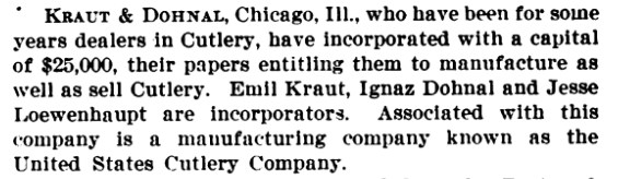 YOUTUBE Олег Бритва INSTAGRAM Олег Бритва Re: Kraut&DonhalГ-н Dohnal родился в городе Tracht, в Моравии, Чехословакия, 31 июля 1863 года. Родители: Франц Dohnal и Барбара (Новотны). В 13 лет он начал работать подмастерьем на разных заводах по производству столовых приборов, а также режущих и хирургических инструментов в Вене (Австрия). Став экспертом в этой области и, не имея возможности продвижения по службе, он решил уехать в Америку и найти работу там. В возрасте 23х лет, соответственно в 1886 году он на некоторое время остановился в Нью-Йорке, затем переехал в Чикаго, где устроился в фирму Sharp & Smith (дилеры и производители хирургического инструмента). В 1890 году начинает работать в фирме Rosenstock & Company. Как самый экспертный работник через четыре года он становится партнером в этой фирме, и в 1895 году название фирмы меняется на Kraut & Dohnal, а 1896 года весь бизнес перерегистрируется фирму Kraut & Dohnal. Inc., где г-н Dohnal, в 1913 году, становится Президентом. Эта корпорация, которая располагается по адресу 325 South Clark Street, занимается импортом и производством столовых приборов, парикмахерских принадлежностей, оптовыми и розничными продажами. Дальше про детей, которые тоже работали в этой фирме. Spoiler Show