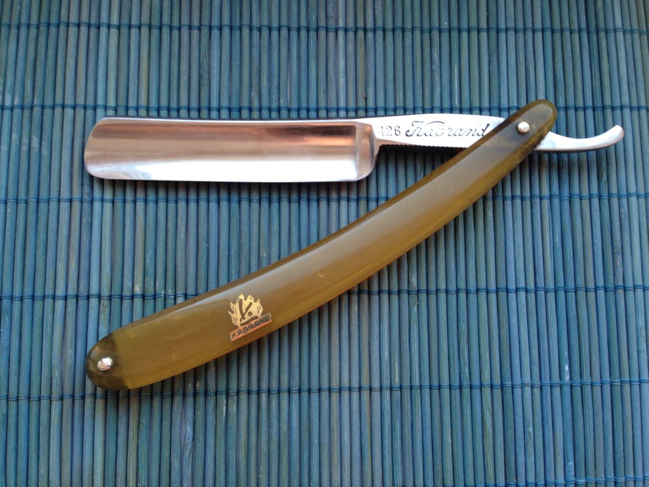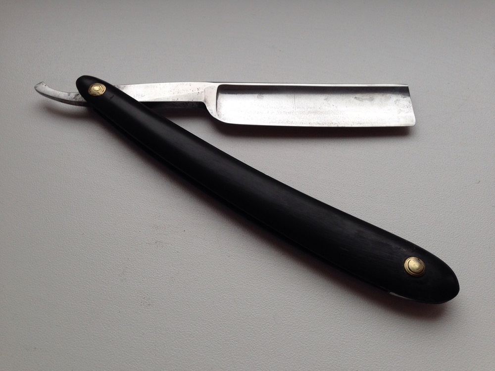 Ширина полотна 6/8 , оригинальные пины из латуни и ручка из рога . Заточена и готова к бритью .