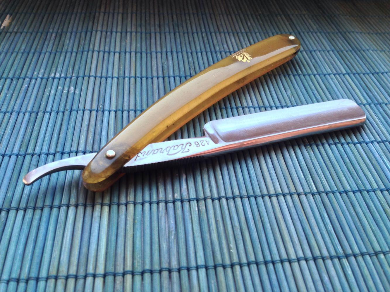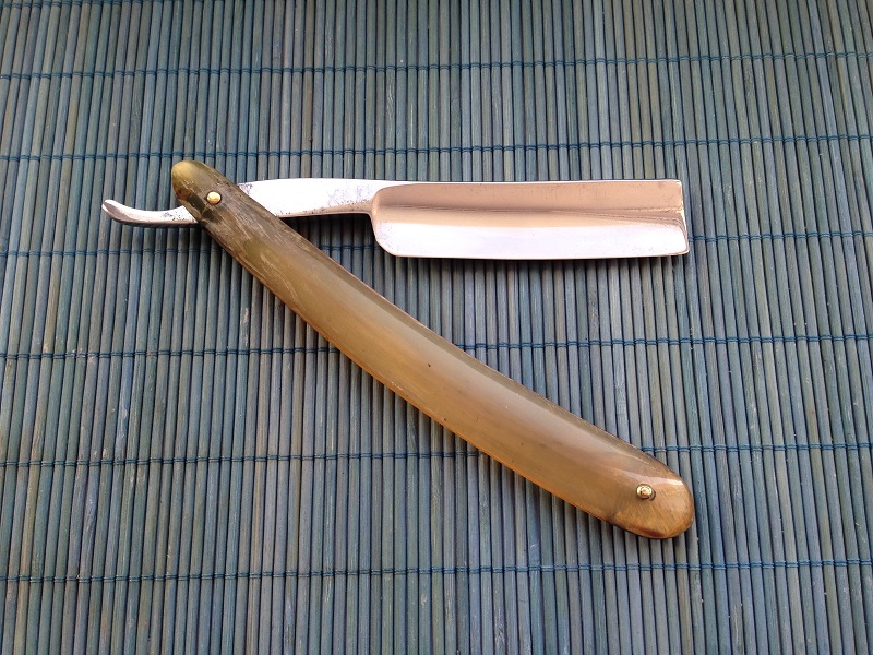 Ширина полотна 6/8 , оригинальные пины из латуни и ручка из рога . Заточена и готова к бритью .