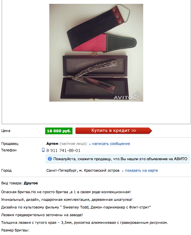- Ремонт опасных бритв, звонить с 11-00 до 23-00, +79267729357, спросить Олега.